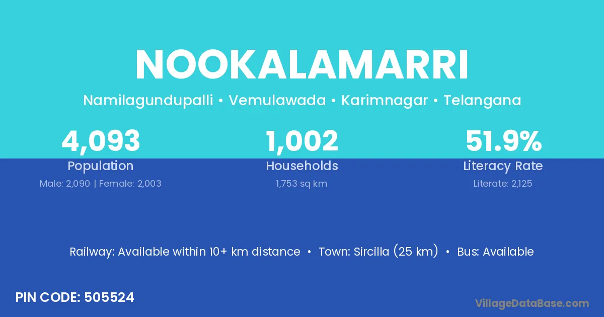 Sircilla (25 km) is the nearest town to Nookalamarri village for major economic activities and is located approximately 25 km away.