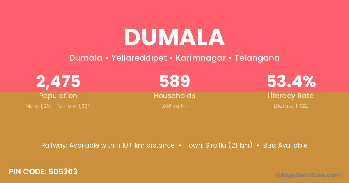 Sircilla (21 km) is the nearest town to Dumala village for major economic activities and is located approximately 21 km away.