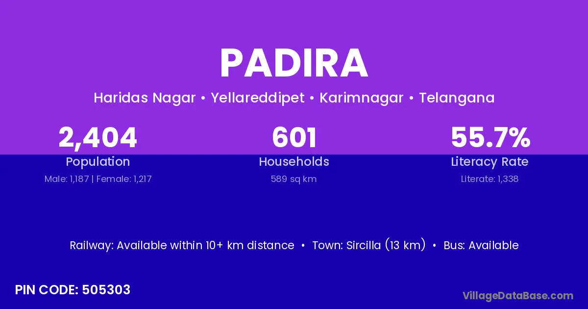 Sircilla (13 km) is the nearest town to Padira village for major economic activities and is located approximately 13 km away.