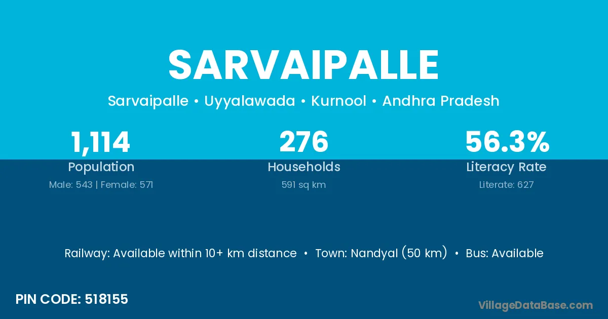 Sircilla (20 km) is the nearest town to Sarvaipalle village for major economic activities and is located approximately 20 km away.