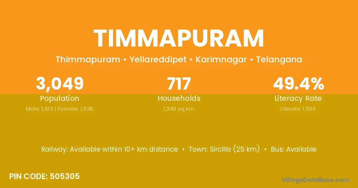 Sircilla (25 km) is the nearest town to Timmapuram village for major economic activities and is located approximately 25 km away.