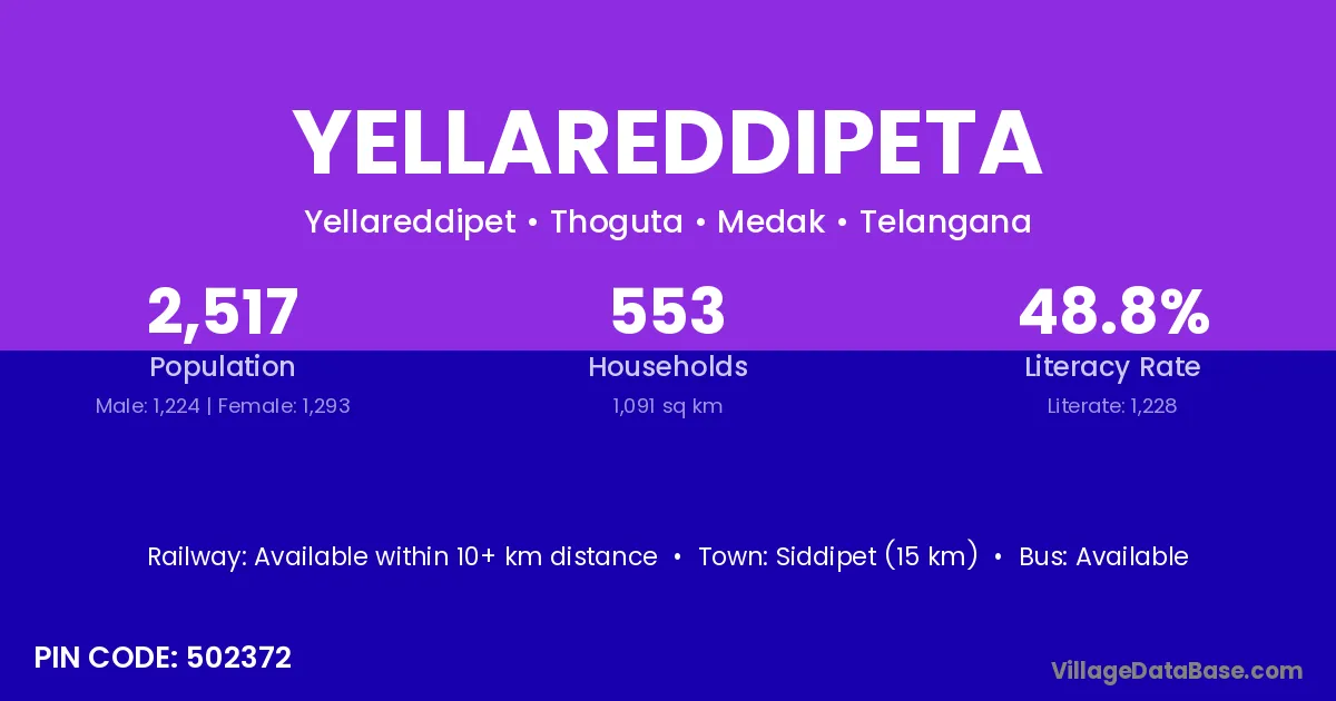 Sircilla (18 km) is the nearest town to Yellareddipeta village for major economic activities and is located approximately 18 km away.