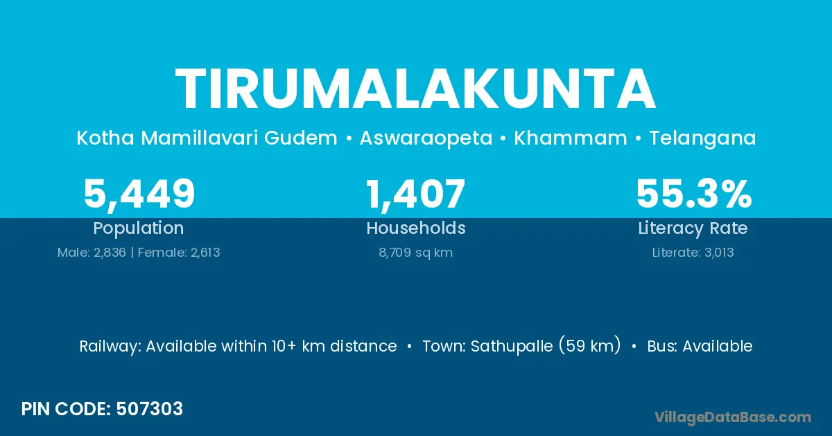 Sathupalle (59 km) is the nearest town to Tirumalakunta village for major economic activities and is located approximately 59 km away.