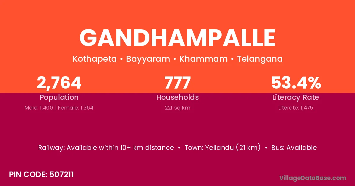 Yellandu (21 km) is the nearest town to Gandhampalle village for major economic activities and is located approximately 21 km away.