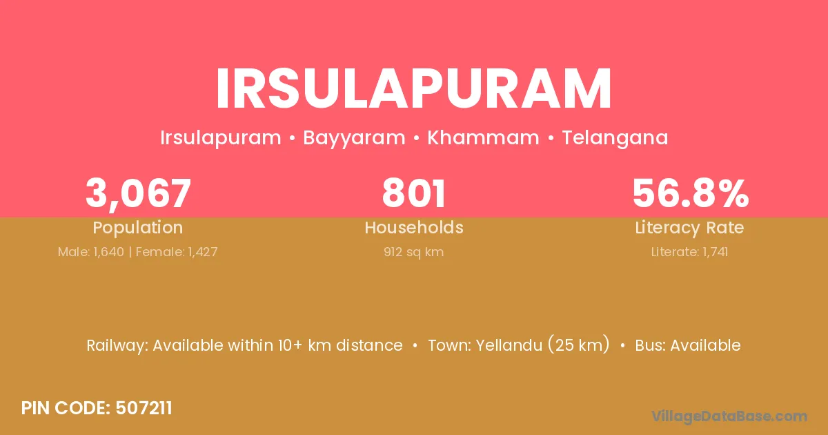Yellandu (25 km) is the nearest town to Irsulapuram village for major economic activities and is located approximately 25 km away.
