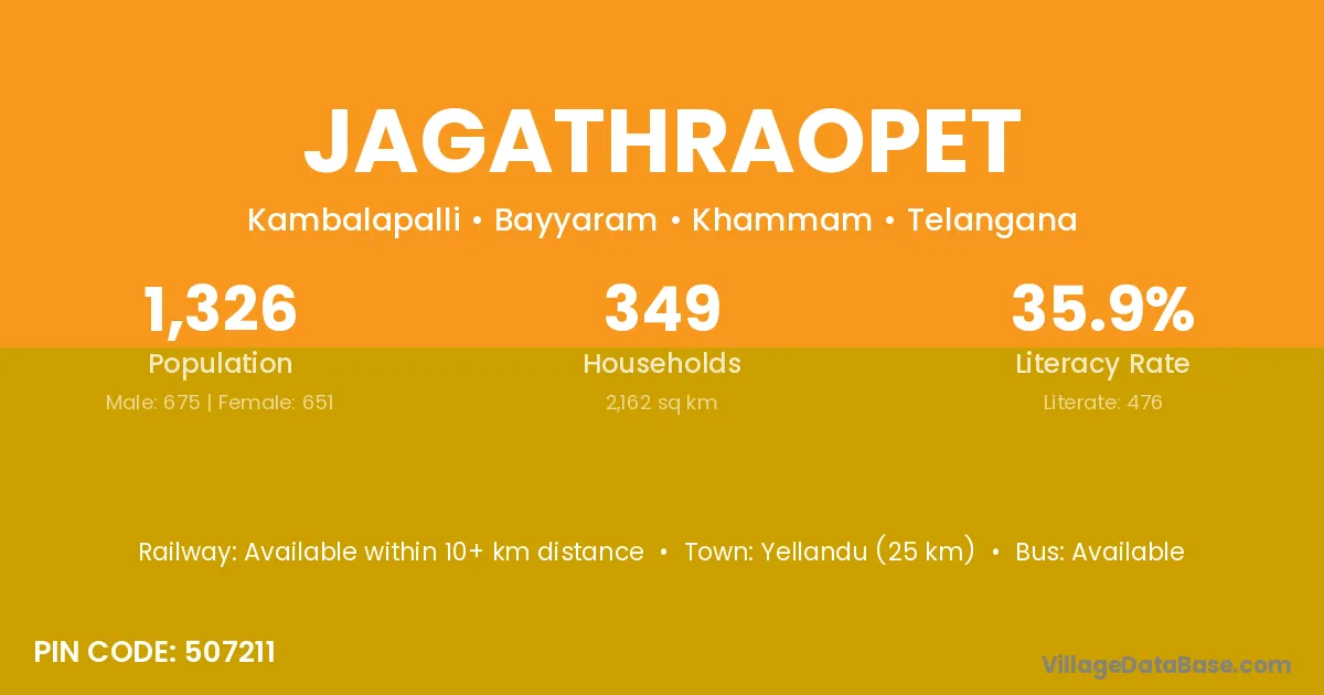 Yellandu (25 km) is the nearest town to Jagathraopet village for major economic activities and is located approximately 25 km away.