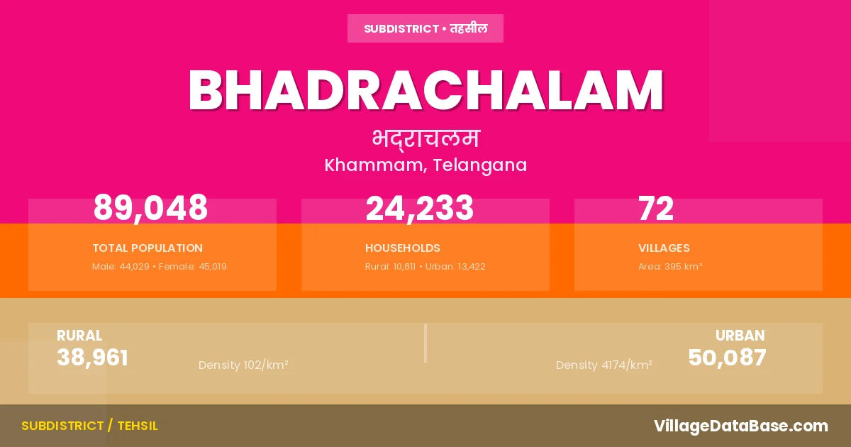 According to the 2011 census The total area of Bhadrachalam Mandal is 395 km², with a population of 89048 people. The population density is 226 inhabitants per square kilometre, and there are approximately 24233 houses in the sub district.