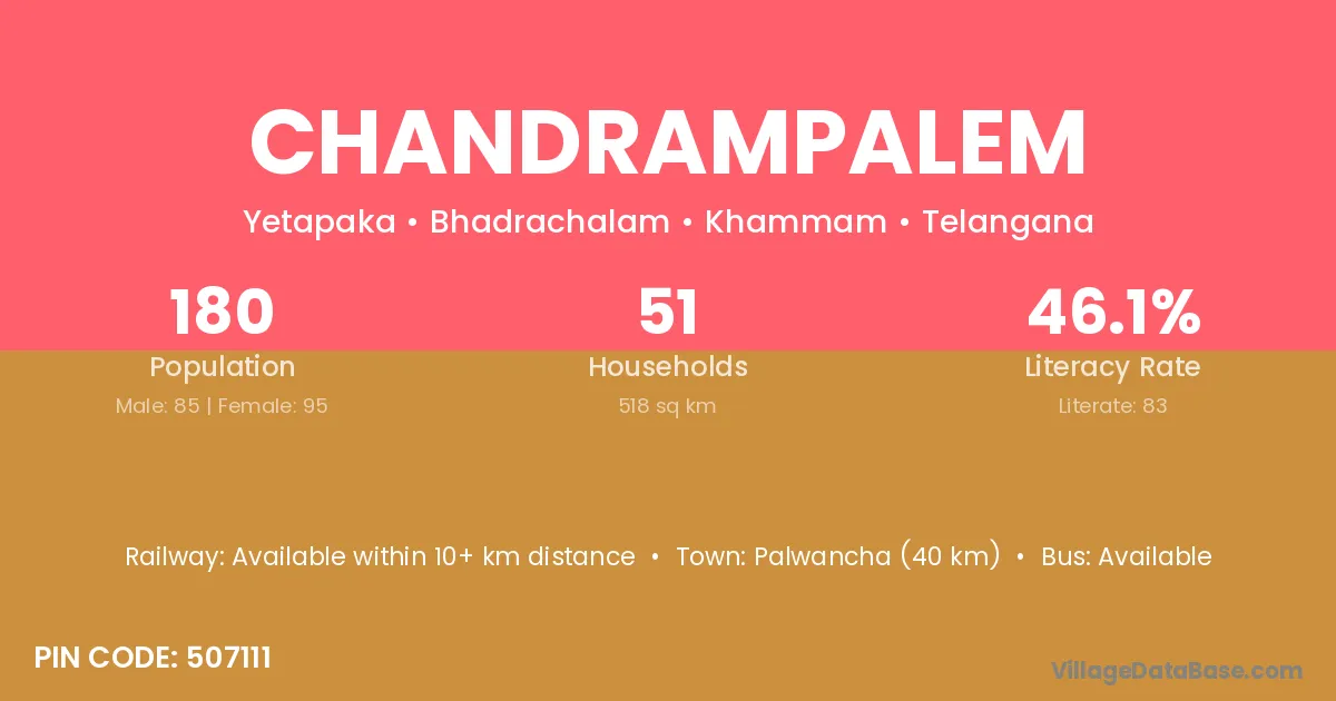 Palwancha (40 km) is the nearest town to Chandrampalem village for major economic activities and is located approximately 40 km away.