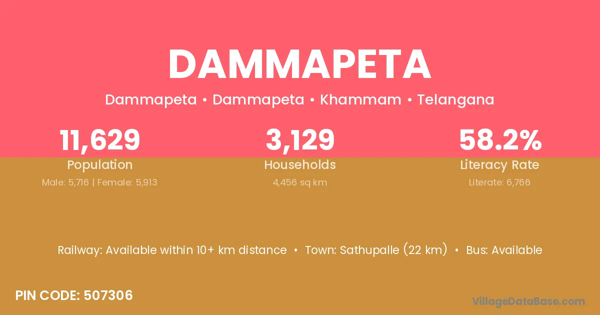 Palwancha (60 km) is the nearest town to Dammapeta village for major economic activities and is located approximately 60 km away.
