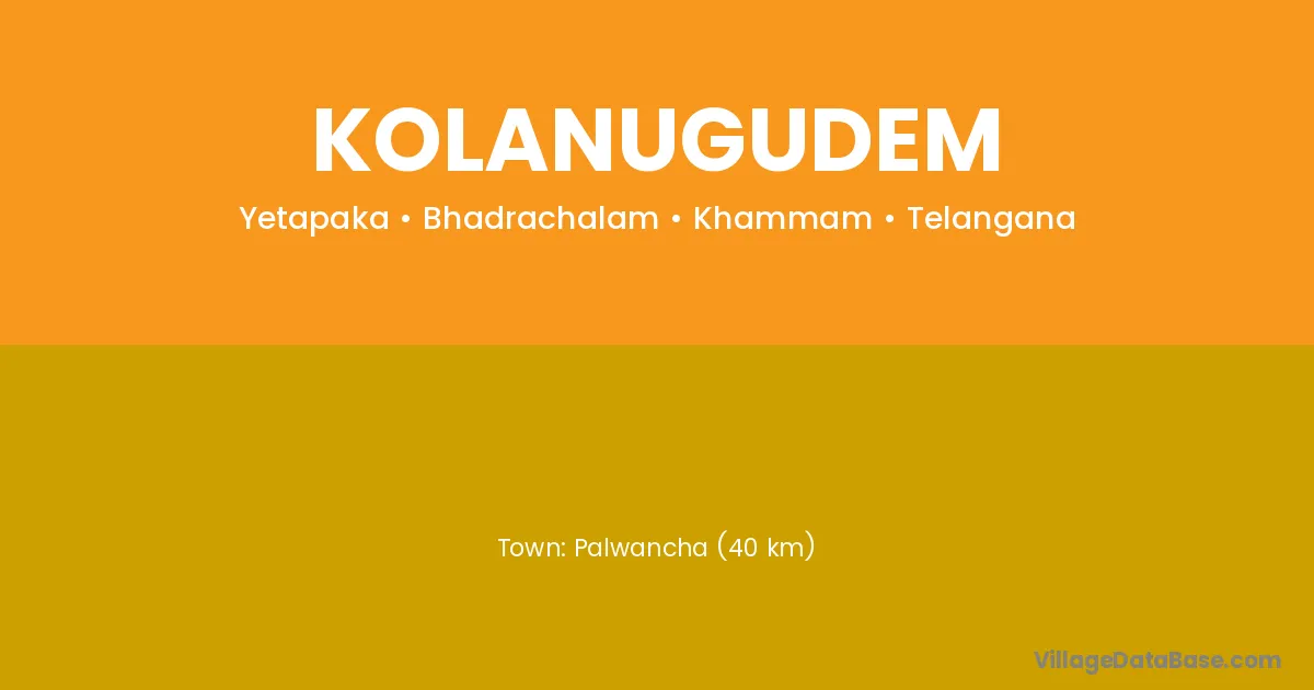 Palwancha (40 km) is the nearest town to Kolanugudem village for major economic activities and is located approximately 40 km away.