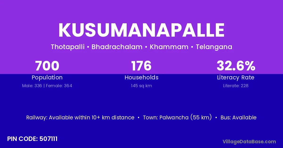 Palwancha (55 km) is the nearest town to Kusumanapalle village for major economic activities and is located approximately 55 km away.