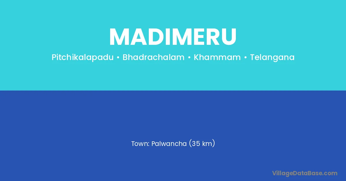 Palwancha (35 km) is the nearest town to Madimeru village for major economic activities and is located approximately 35 km away.