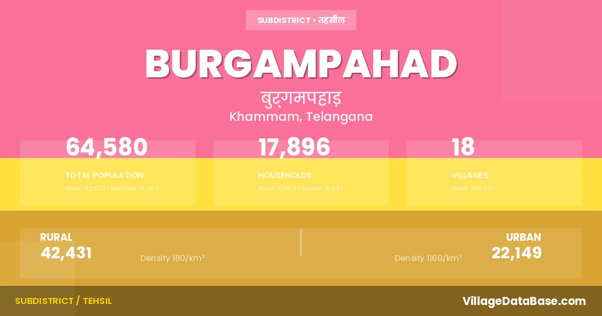According to the 2011 census The total area of Burgampahad Mandal is 255 km², with a population of 64580 people. The population density is 253 inhabitants per square kilometre, and there are approximately 17896 houses in the sub district.