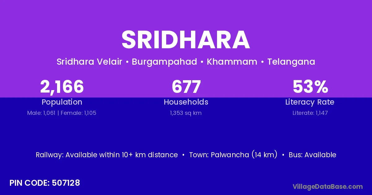Palwancha (14 km) is the nearest town to Sridhara village for major economic activities and is located approximately 14 km away.