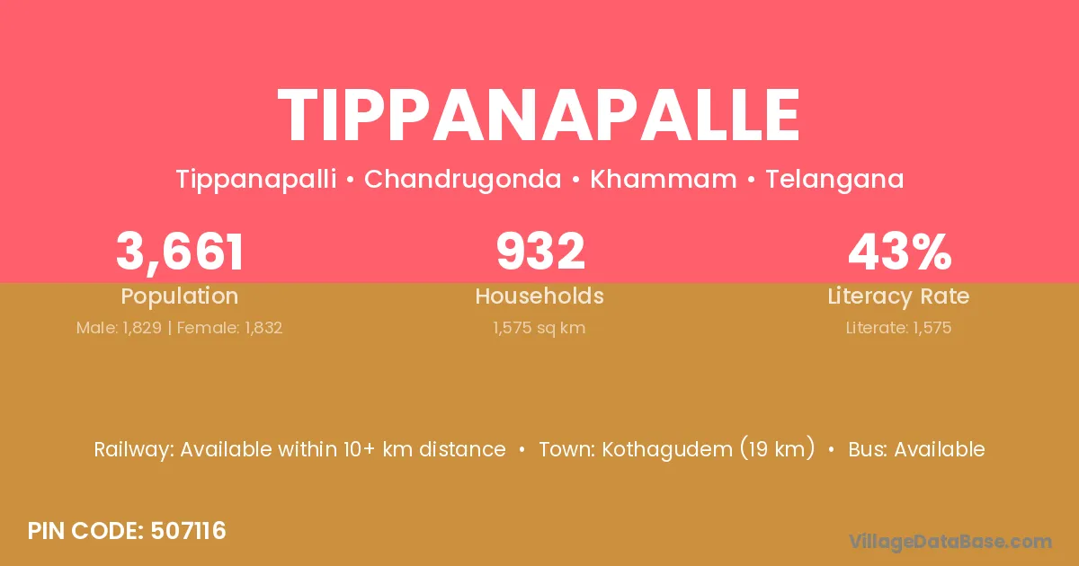 Kothagudem (19 km) is the nearest town to Tippanapalle village for major economic activities and is located approximately 19 km away.