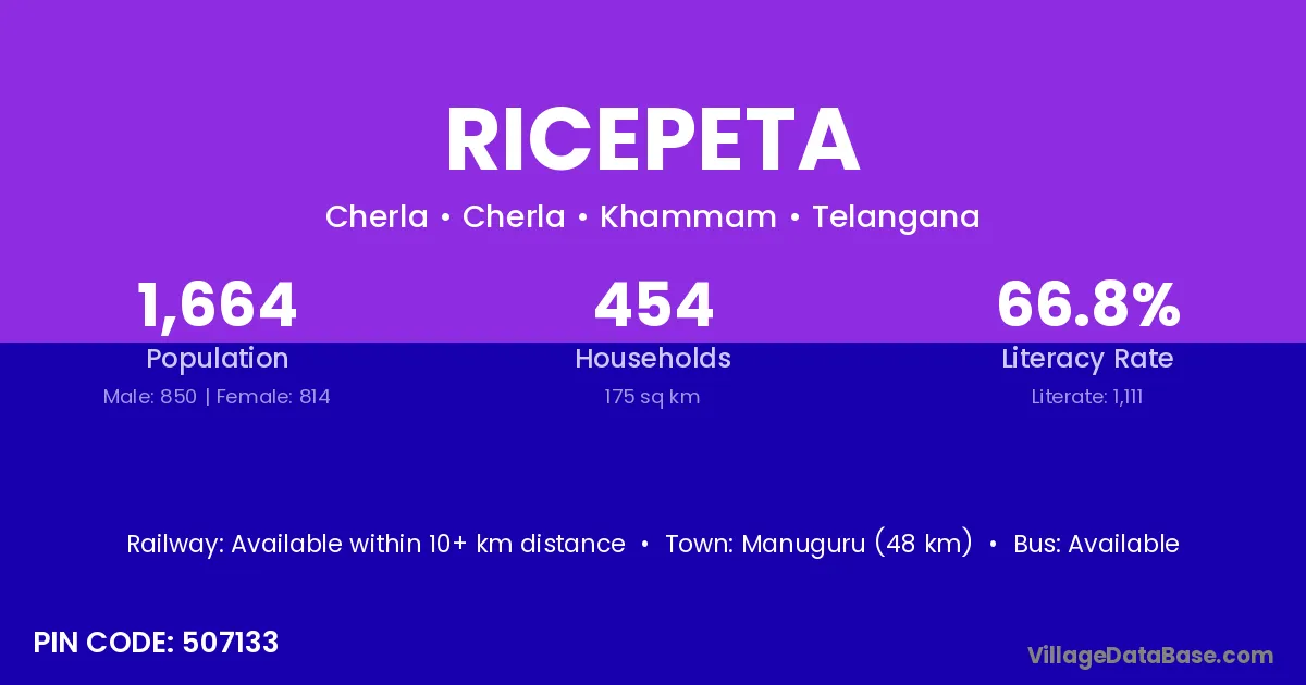 Manuguru (48 km) is the nearest town to Ricepeta village for major economic activities and is located approximately 48 km away.