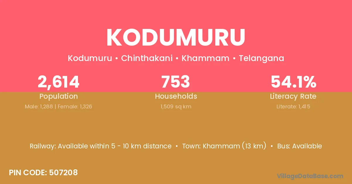 Khammam (13 km) is the nearest town to Kodumuru village for major economic activities and is located approximately 13 km away.