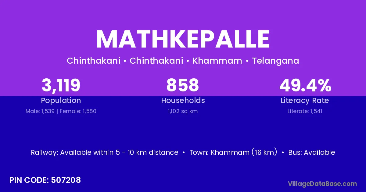 Mathkepalle village has a total population of 3,119 people, of which 1,539 are males and 1,580 are females.
