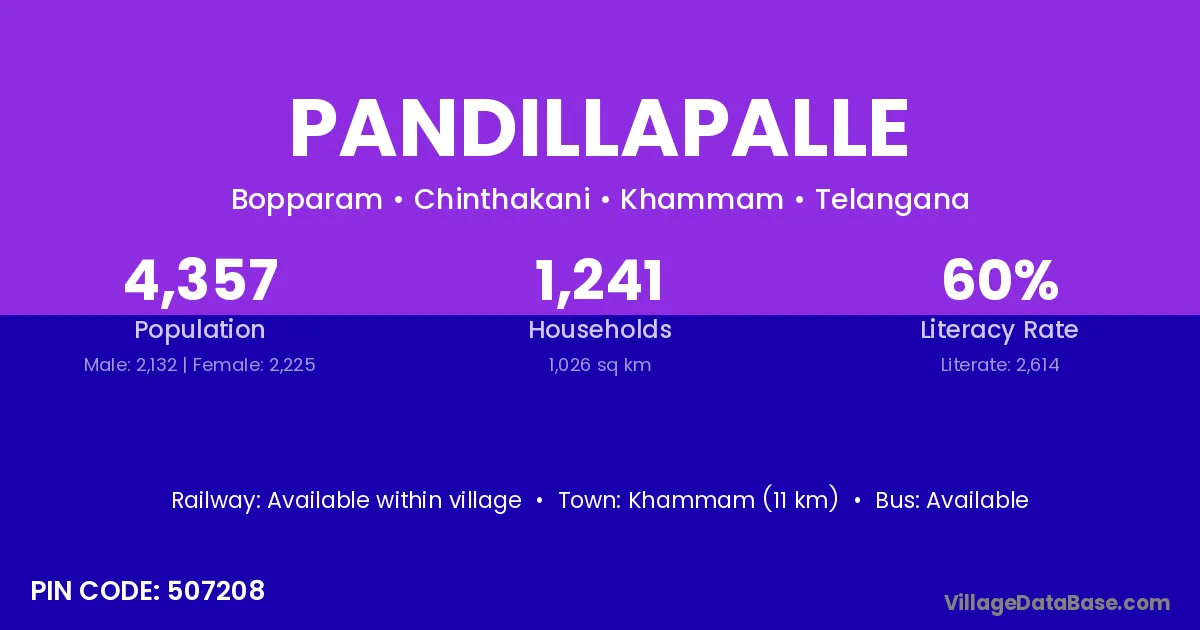 Khammam (11 km) is the nearest town to Pandillapalle village for major economic activities and is located approximately 11 km away.