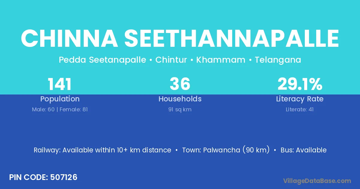 Palwancha (90 km) is the nearest town to Chinna Seethannapalle village for major economic activities and is located approximately 90 km away.