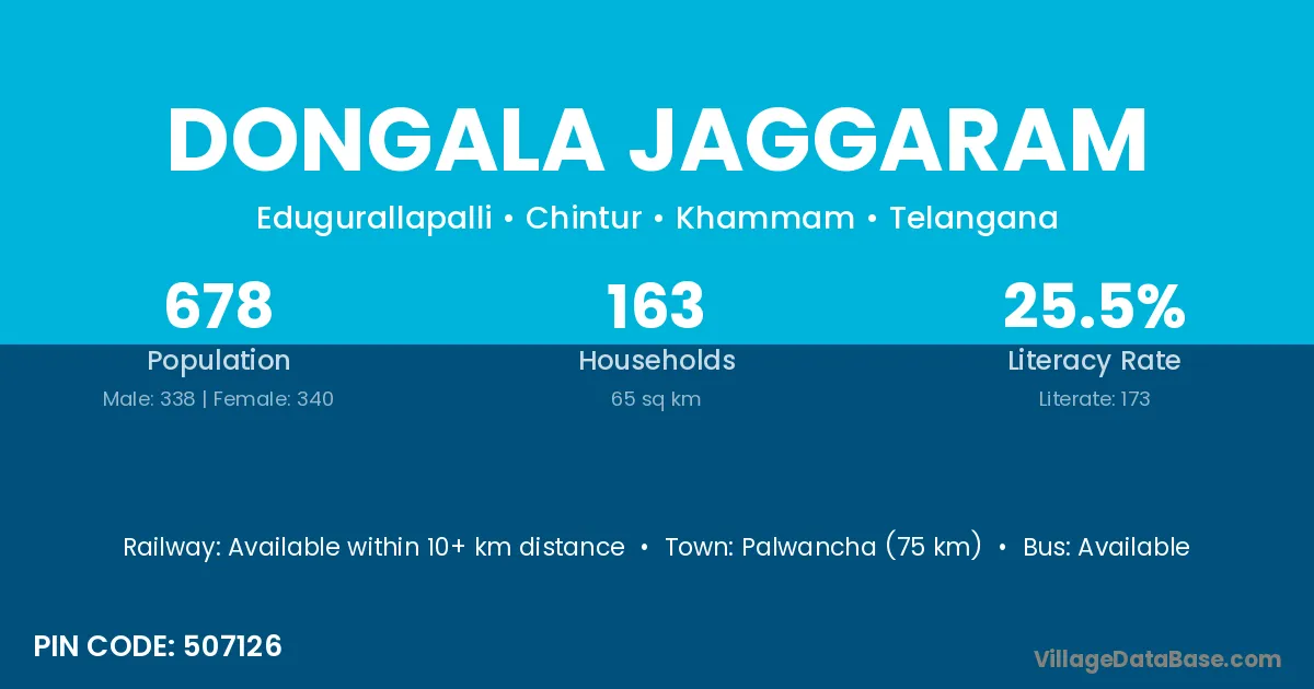 Palwancha (75 km) is the nearest town to Dongala Jaggaram village for major economic activities and is located approximately 75 km away.