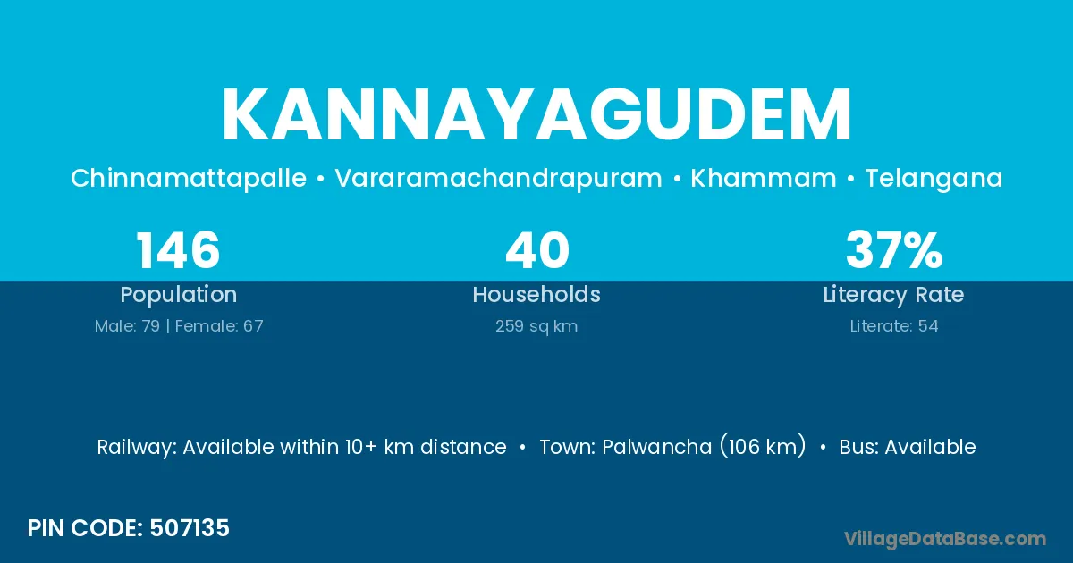 Palwancha (95 km) is the nearest town to Kannayagudem village for major economic activities and is located approximately 95 km away.