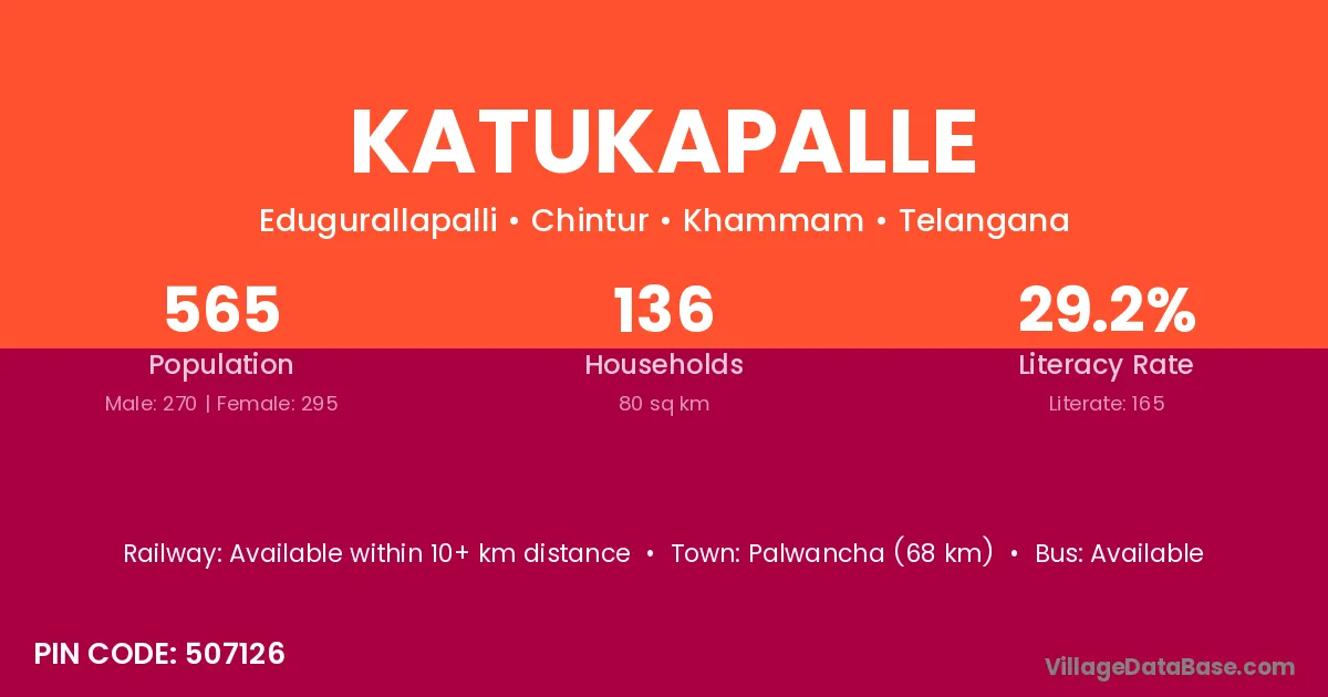 Palwancha (68 km) is the nearest town to Katukapalle village for major economic activities and is located approximately 68 km away.