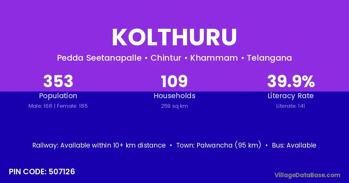 Palwancha (95 km) is the nearest town to Kolthuru village for major economic activities and is located approximately 95 km away.