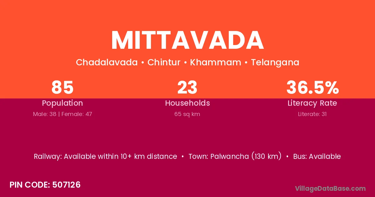 Palwancha (130 km) is the nearest town to Mittavada village for major economic activities and is located approximately 130 km away.