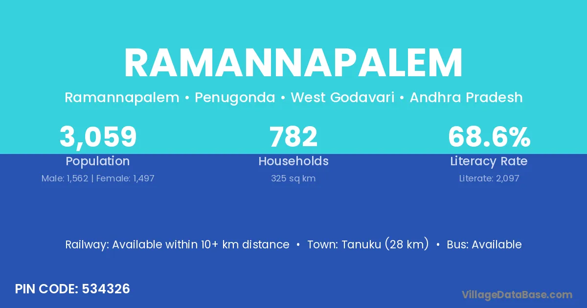 The literacy rate of Ramannapalem village is 47.30%. Male literacy stands at 53.59% and female literacy at 41.70%.