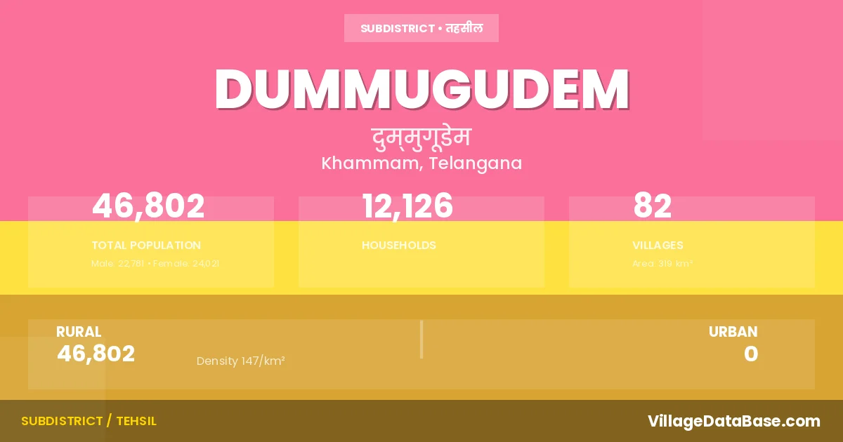According to the 2011 census The total area of Dummugudem Mandal is 319 km², with a population of 46802 people. The population density is 147 inhabitants per square kilometre, and there are approximately 12126 houses in the sub district.