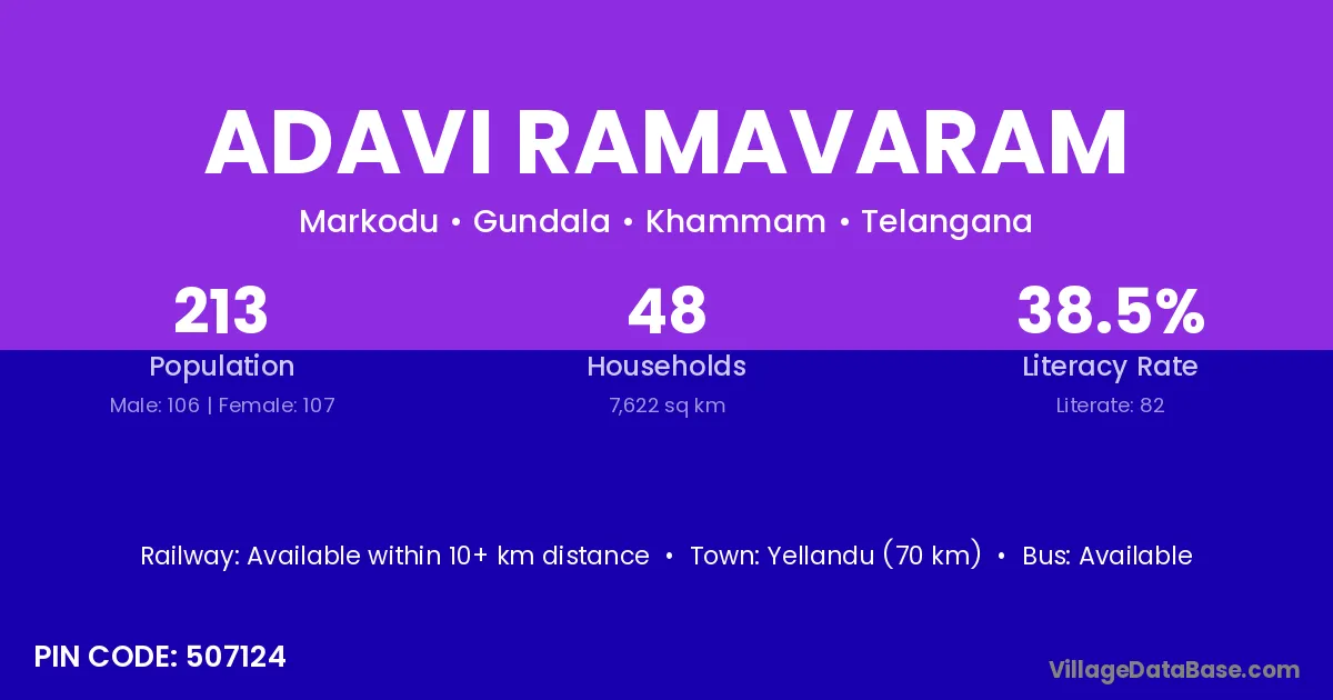Manuguru (68 km) is the nearest town to Adavi Ramavaram village for major economic activities and is located approximately 68 km away.