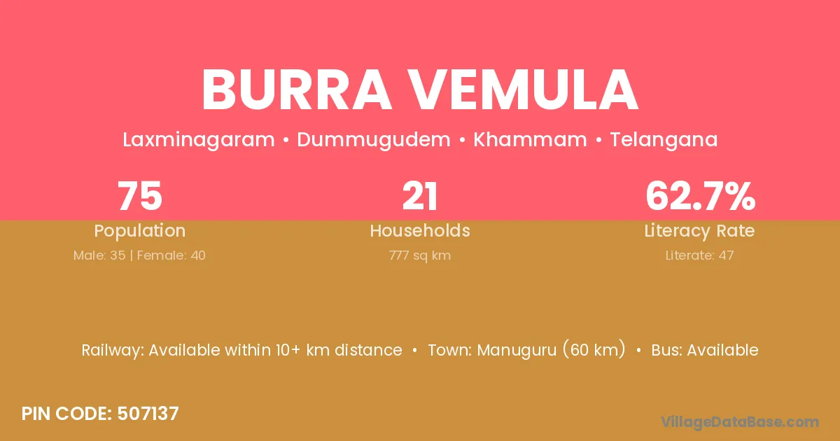 Manuguru (60 km) is the nearest town to Burra Vemula village for major economic activities and is located approximately 60 km away.