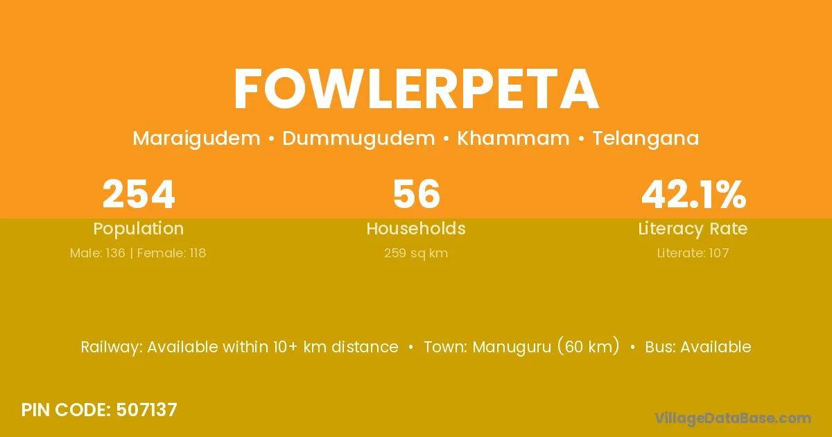 Manuguru (60 km) is the nearest town to Fowlerpeta village for major economic activities and is located approximately 60 km away.