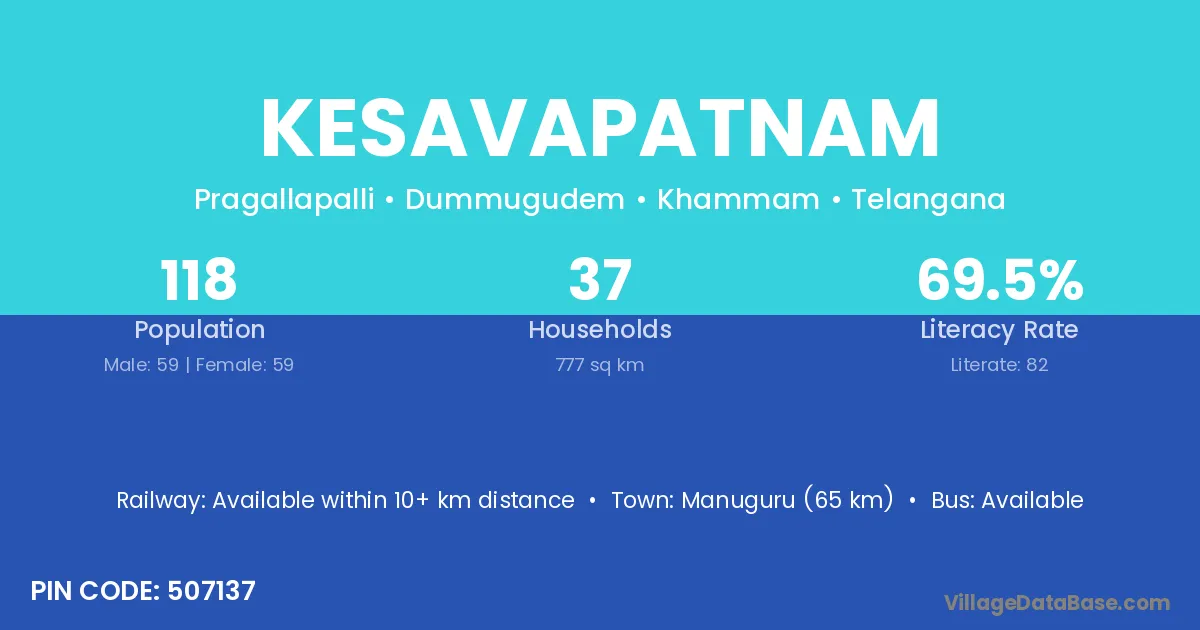 Manuguru (65 km) is the nearest town to Kesavapatnam village for major economic activities and is located approximately 65 km away.