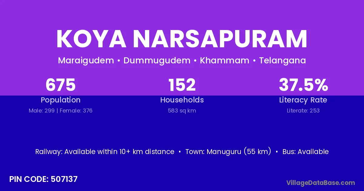 Manuguru (55 km) is the nearest town to Koya Narsapuram village for major economic activities and is located approximately 55 km away.