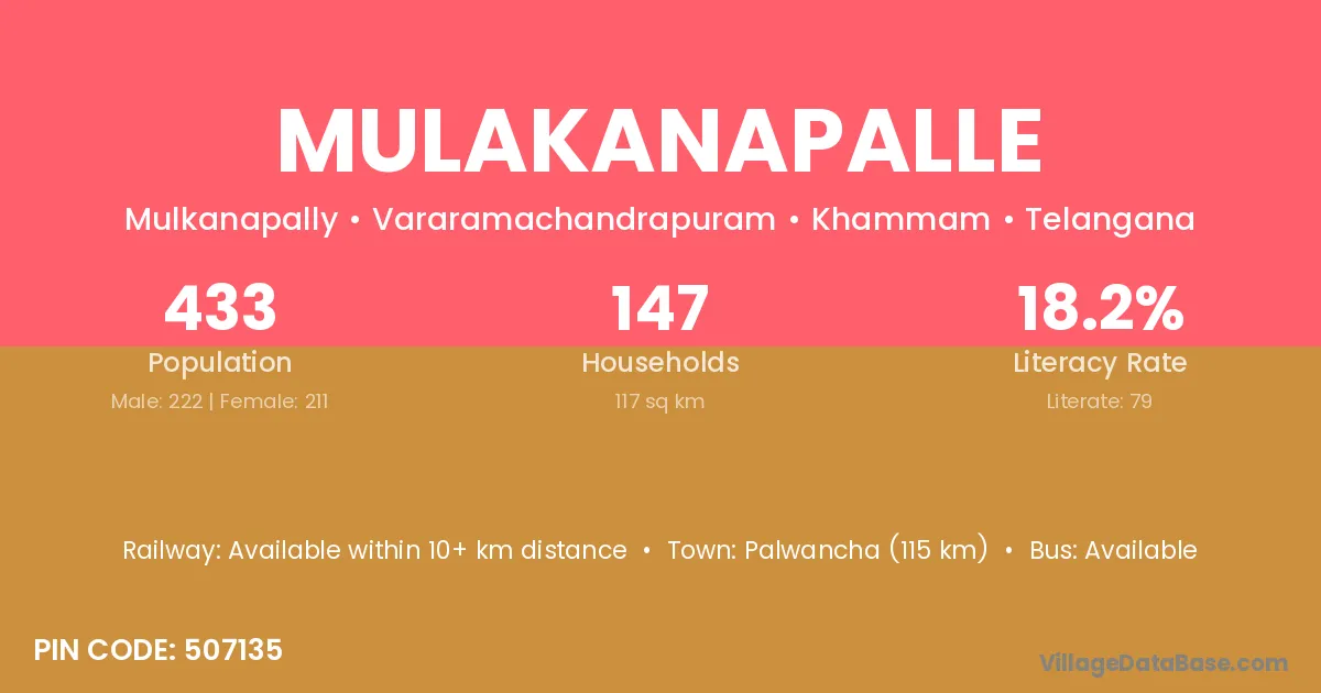 Manuguru (60 km) is the nearest town to Mulakanapalle village for major economic activities and is located approximately 60 km away.