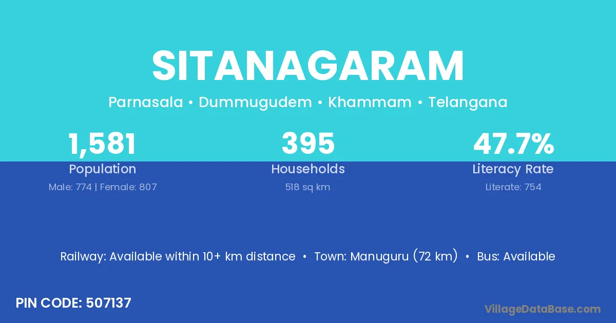 Manuguru (72 km) is the nearest town to Sitanagaram village for major economic activities and is located approximately 72 km away.