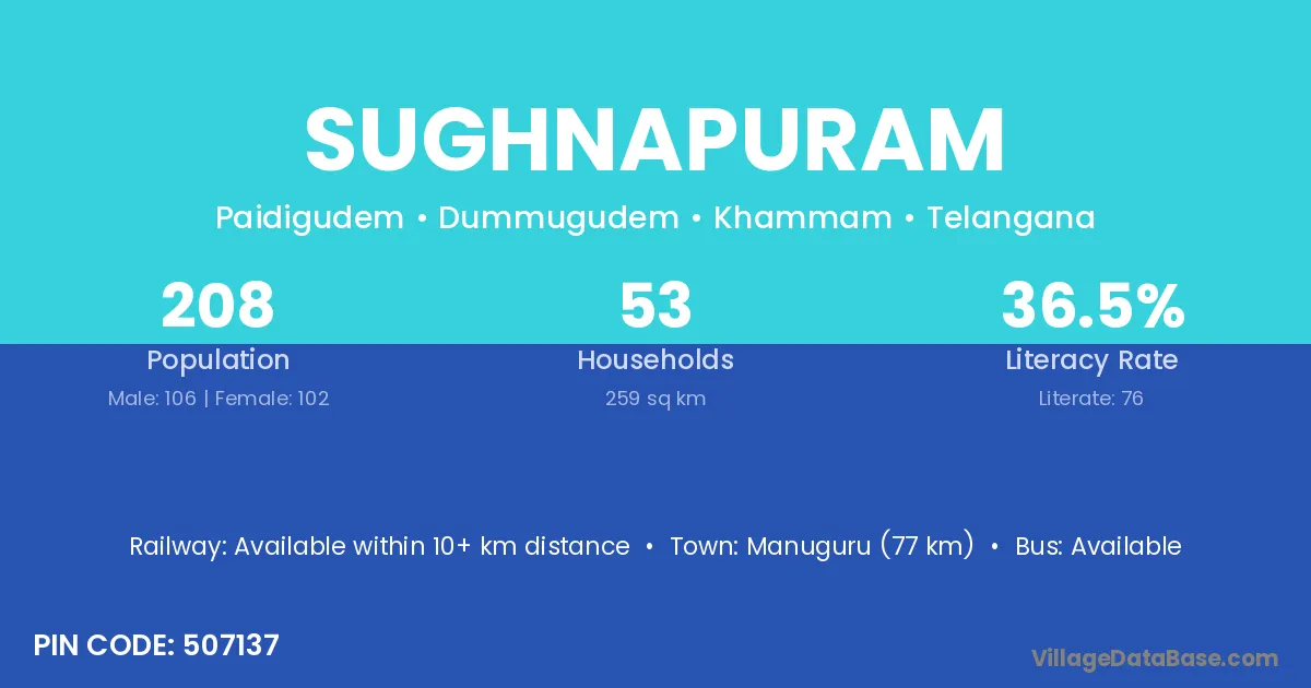 Manuguru (77 km) is the nearest town to Sughnapuram village for major economic activities and is located approximately 77 km away.