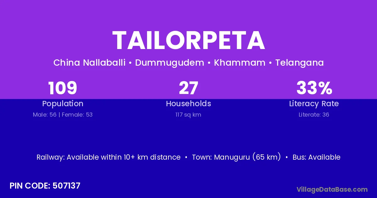 Tailorpeta village has a total population of 109 people, of which 56 are males and 53 are females.