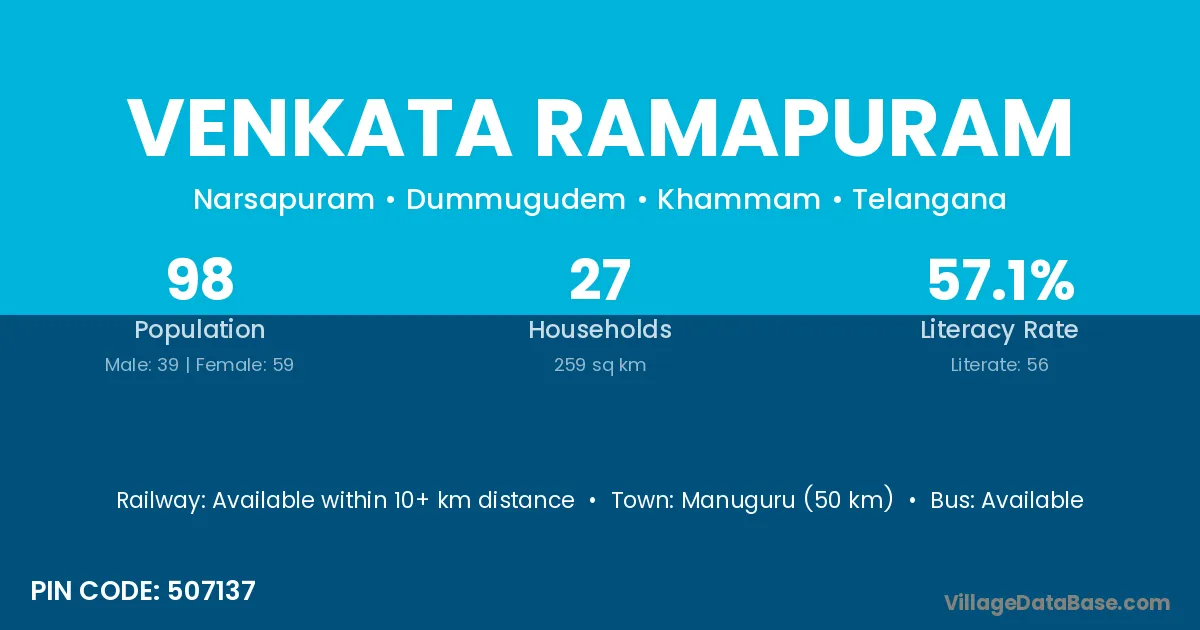 Manuguru (50 km) is the nearest town to Venkata Ramapuram village for major economic activities and is located approximately 50 km away.