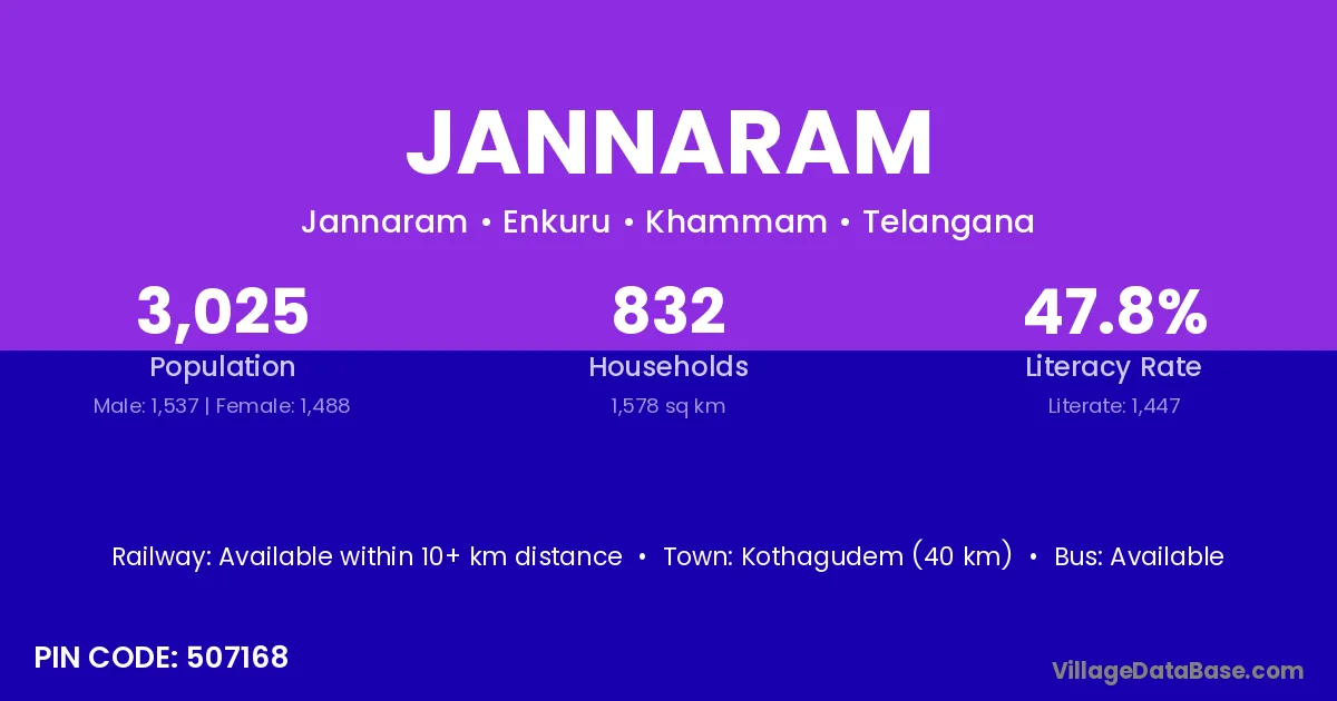 Kothagudem (40 km) is the nearest town to Jannaram village for major economic activities and is located approximately 40 km away.