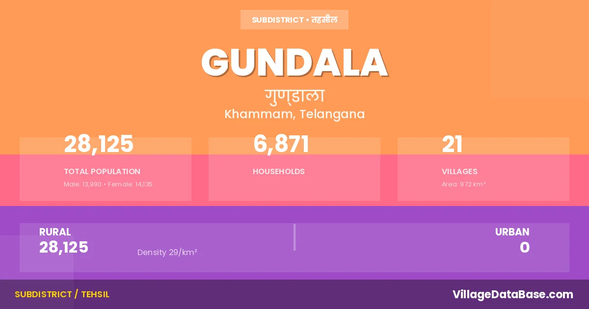 According to the 2011 census The total area of Gundala Mandal is 972 km², with a population of 28125 people. The population density is 29 inhabitants per square kilometre, and there are approximately 6871 houses in the sub district.