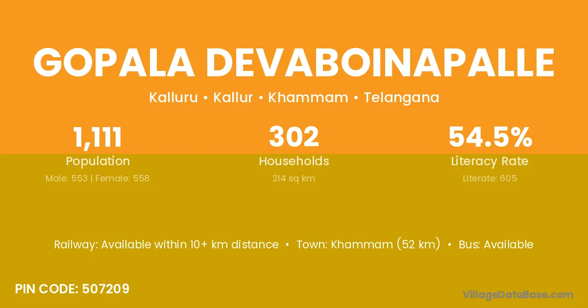 Khammam (52 km) is the nearest town to Gopala Devaboinapalle village for major economic activities and is located approximately 52 km away.