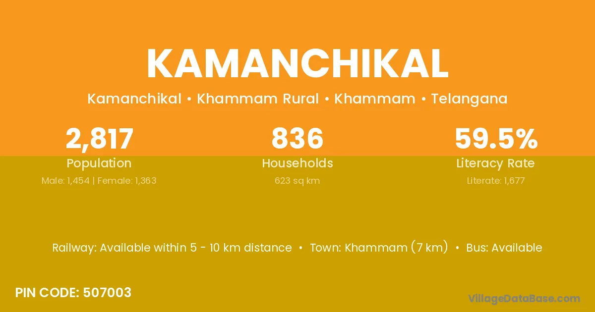 Khammam (7 km) is the nearest town to Kamanchikal village for major economic activities and is located approximately 7 km away.