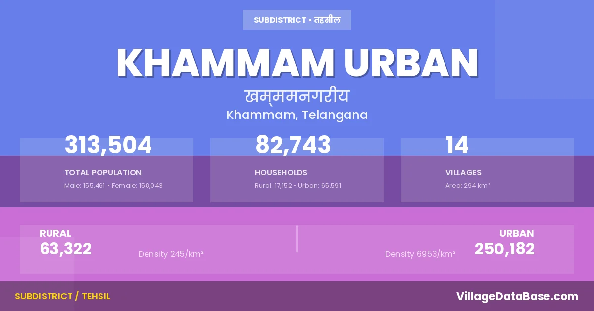 According to the 2011 census The total area of Khammam Urban Mandal is 294 km², with a population of 313504 people. The population density is 1,065 inhabitants per square kilometre, and there are approximately 82743 houses in the sub district.