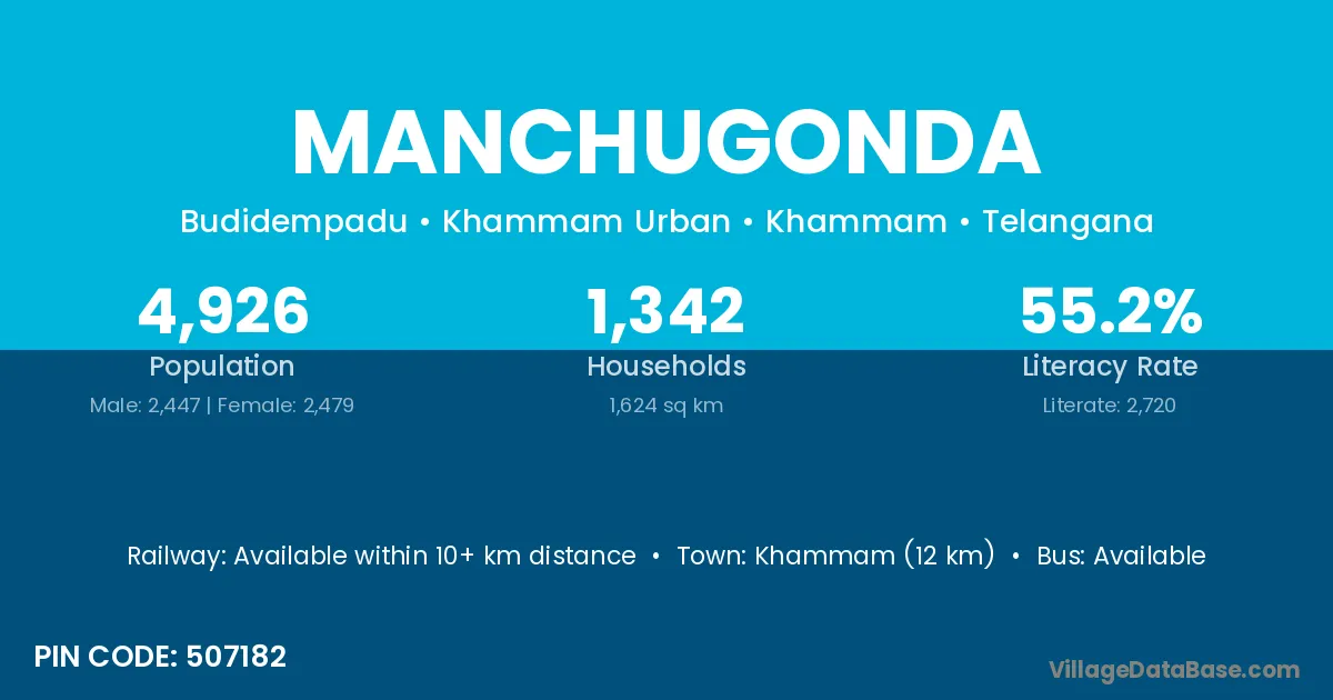 Khammam (12 km) is the nearest town to Manchugonda village for major economic activities and is located approximately 12 km away.