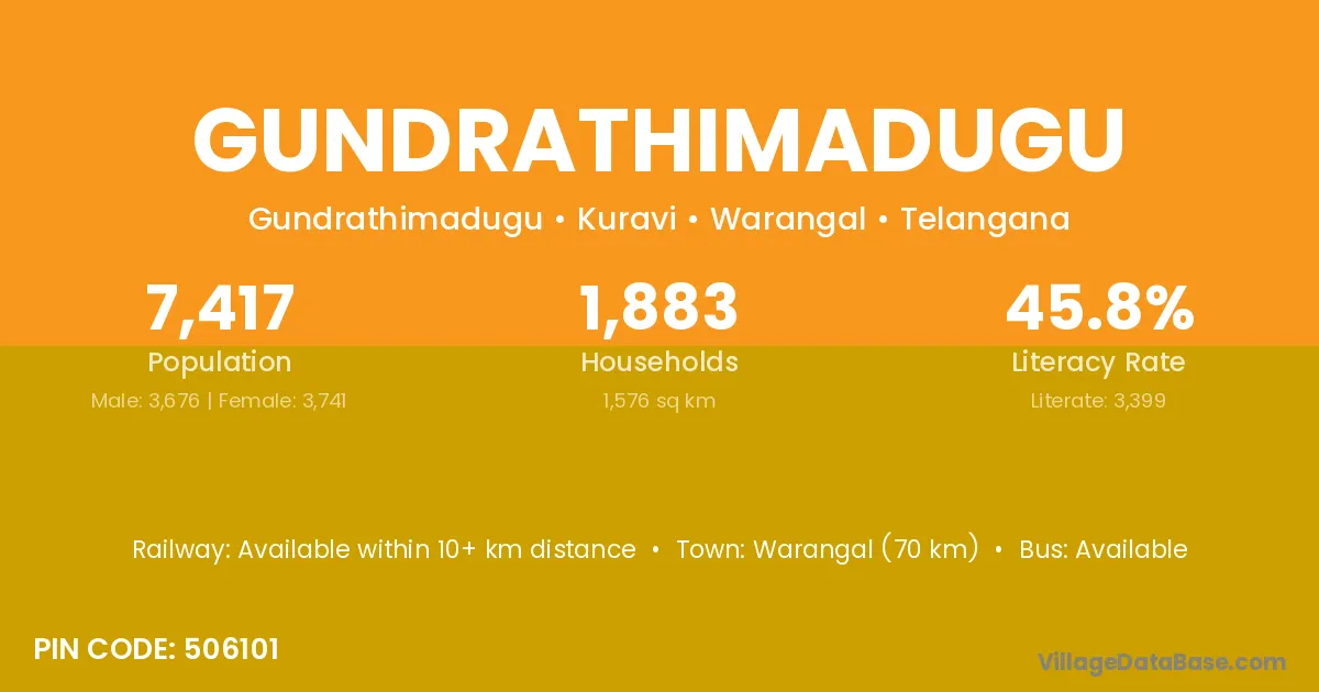 Gundrathimadugu village has a total population of 3,208 people, of which 1,603 are males and 1,605 are females.