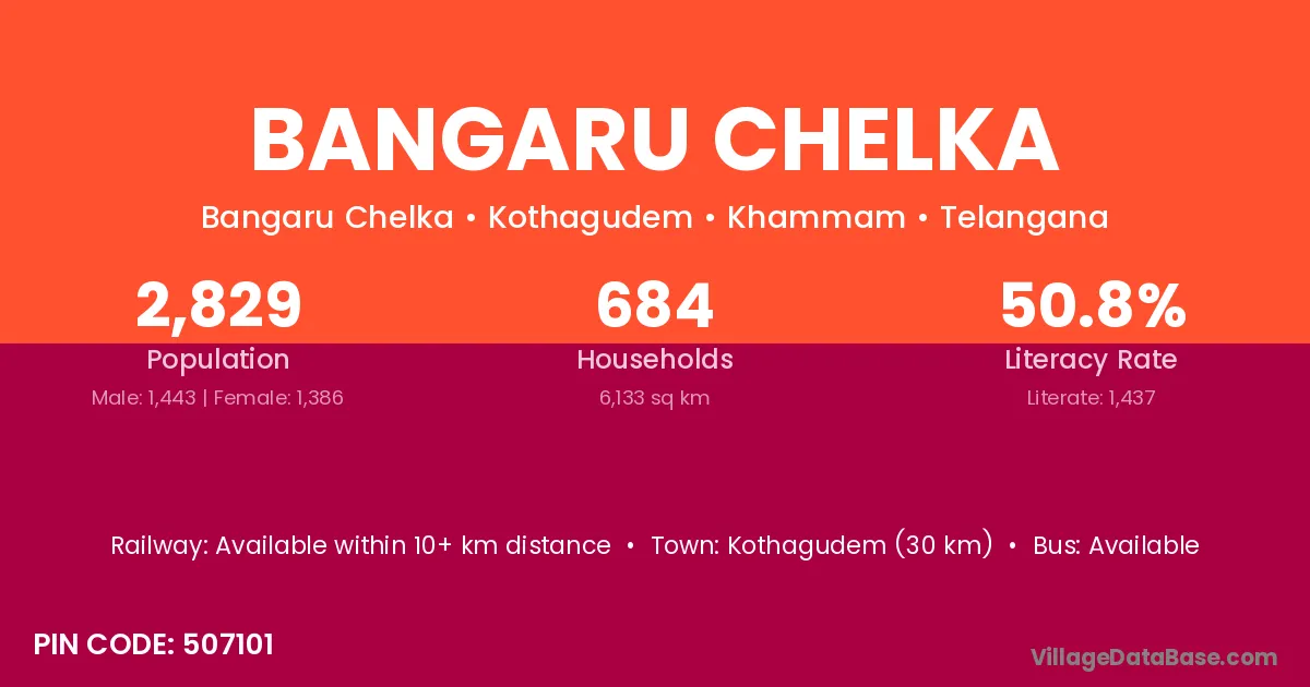Kothagudem (30 km) is the nearest town to Bangaru Chelka village for major economic activities and is located approximately 30 km away.