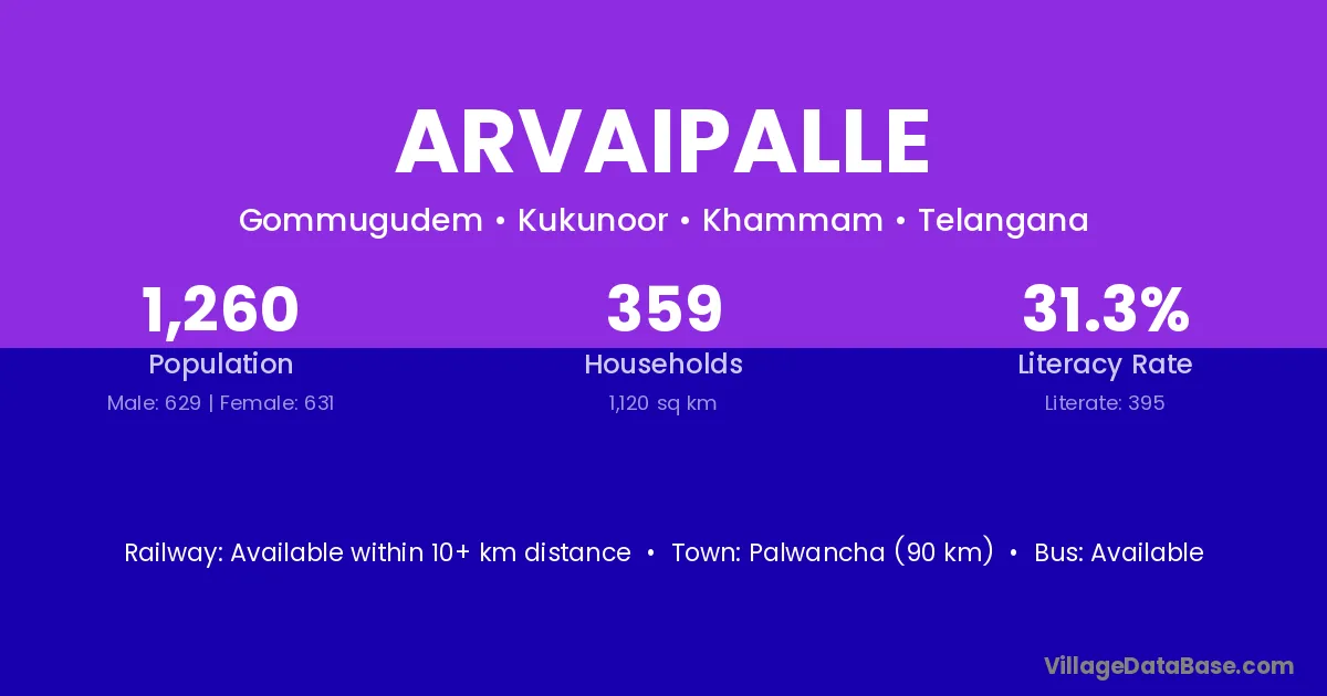 Palwancha (90 km) is the nearest town to Arvaipalle village for major economic activities and is located approximately 90 km away.